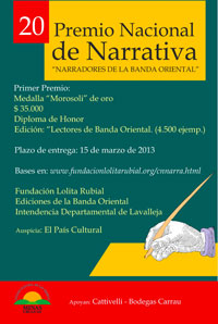 La Fundación "Lolita Rubial" y la Intendencia Departamental de Lavalleja, en acuerdo con Ediciones de la Banda Oriental convocan al 20 Premio Nacional de Narrativa "Narradores de la Banda Oriental, 2012".
